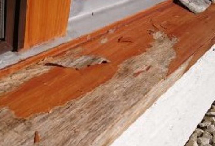 Ursache: fehlende Grundierung und Imprägnierung, vergrautes Holz wurde nicht ausreichend abgeschliffen.